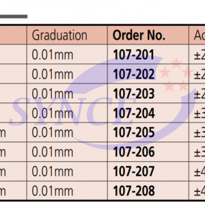 - Panme 107-201 – Được thiết kế để gắn một đồng hồ so cơ hoặc điện tử để đánh giá trực tiếp GO / NG của các bộ phận được sản xuất hàng loạt. Bạn có thể thực hiện các phép đo nhanh chóng bằng cần đo. Có thể chọn các loại đồng hồ so khác nhau phụ thuộc vào mục đích đo
