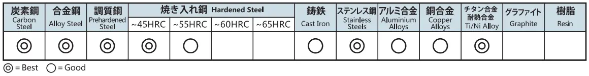 - Sự kết hợp giữa lưỡi cắt bán kính âm và lưỡi xoắn 45 độ tăng cường độ cứng và sắc bén, đặc biệt là ở tốc độ cao. Góc rake dương, cạnh đáy của cạnh hình dạng và rãnh xoắn 53 độ cung cấp khả năng xử lý tốt nhất cho thép, thép đã được gia nhiệt, nhôm và quá trình gia công thép đã được làm cứng và thép carbon với hiệu suất cao. Hoàn thiện tường túi trong quá trình gia công khuôn cơ bản.