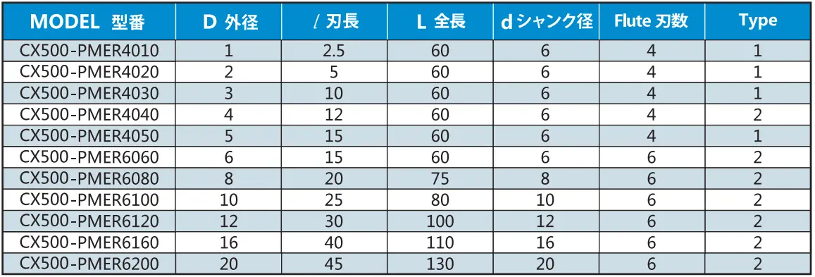 Bảng thông số kích thước của sản phẩm Dao phay CX500-PMER