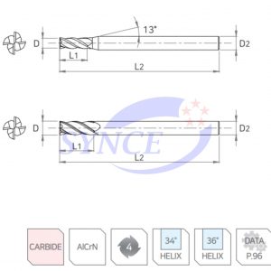 • Dao thiết kế với 4 lưỡi cắt, góc xoắn 34° & 36°