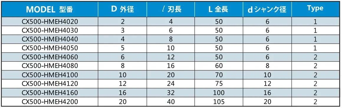 Bảng thông số kích thước của sản phẩm Dao Phay Ngón CX500-HMEH 4F
