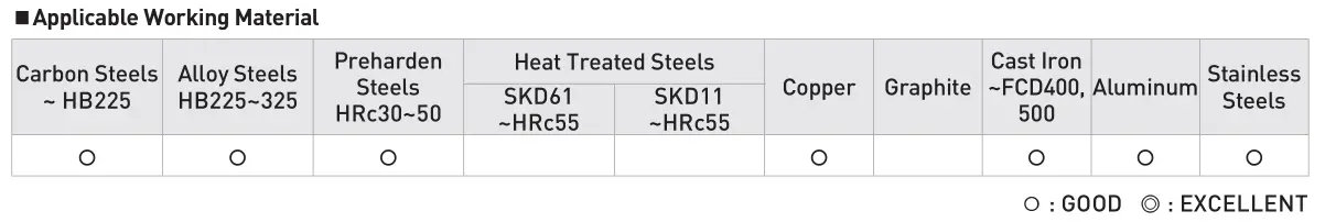 - Nhiều loại phôi khác nhau có thể được gia công bằng cách chọn loại có phủ và không có phủ dưới 50HRC.