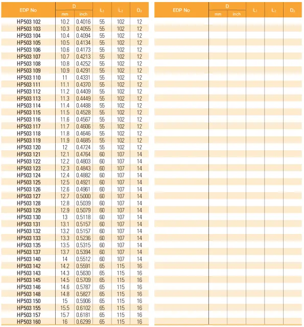 Bảng thông số kích thước của sản phẩm Mũi Khoan Carbide HP503