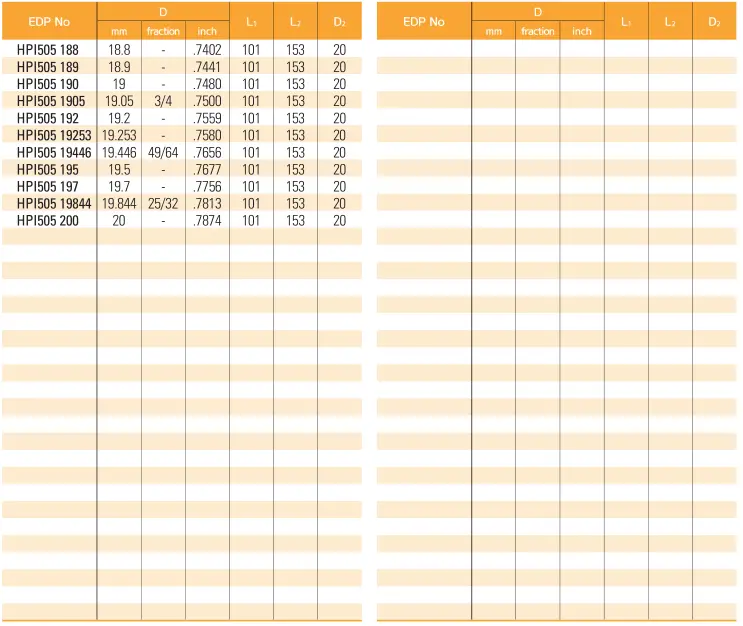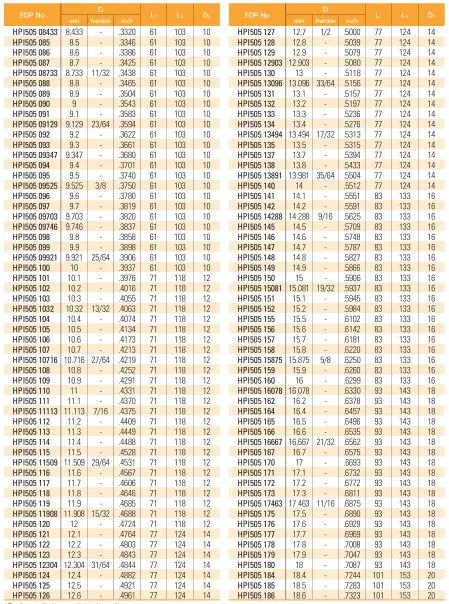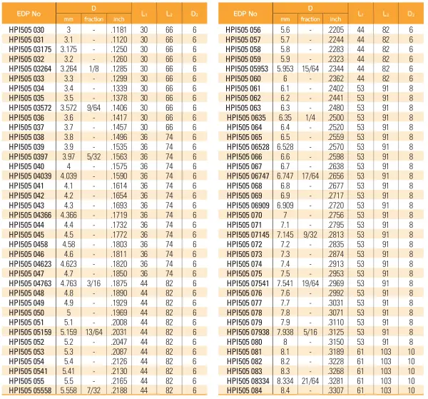 Bảng thông số kích thước của sản phẩm Mũi Khoan Hợp Kim HPI505