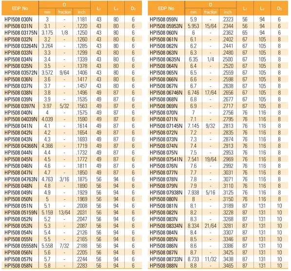 Bảng thông số kích thước của sản phẩm Mũi Khoan Sâu Hợp Kim HPI508—N